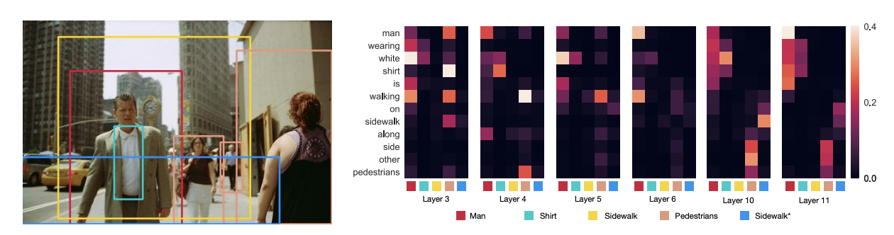 Full Text Slides Video Code Abstract BibTeX DetailsDetailsPre-trained visually grounded language models such as ViLBERT, LXMERT, and UNITER have achieved significant performance improvement on vision-and-language tasks but what they learn during pre-training remains unclear. In this work, we demonstrate that certain attention heads of a visually grounded language model actively ground elements of language to image regions. Specifically, some heads can map entities to image regions, performing the task known as entity grounding. Some heads can even detect the syntactic relations between non-entity words and image regions, tracking, for example, associations between verbs and regions corresponding to their arguments. We denote this ability as \emphsyntactic grounding. We verify grounding both quantitatively and qualitatively, using Flickr30K Entities as a testbed.